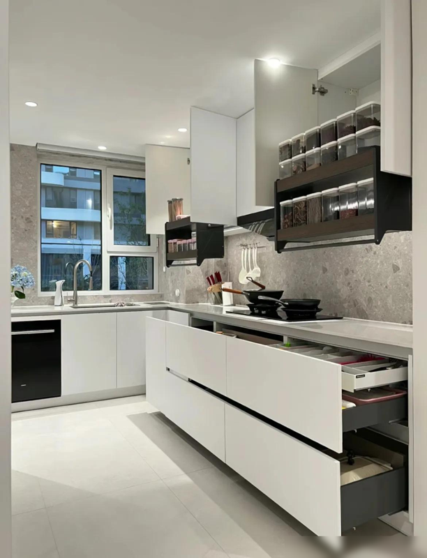 餐边柜是厨房收纳的好帮手,餐边柜通常设计简约实用,能够容纳各种厨房用具, 如餐具、茶具、刀具等,并且配合简单的餐垫、餐巾布等装饰,能够为厨房增添不少时尚感。