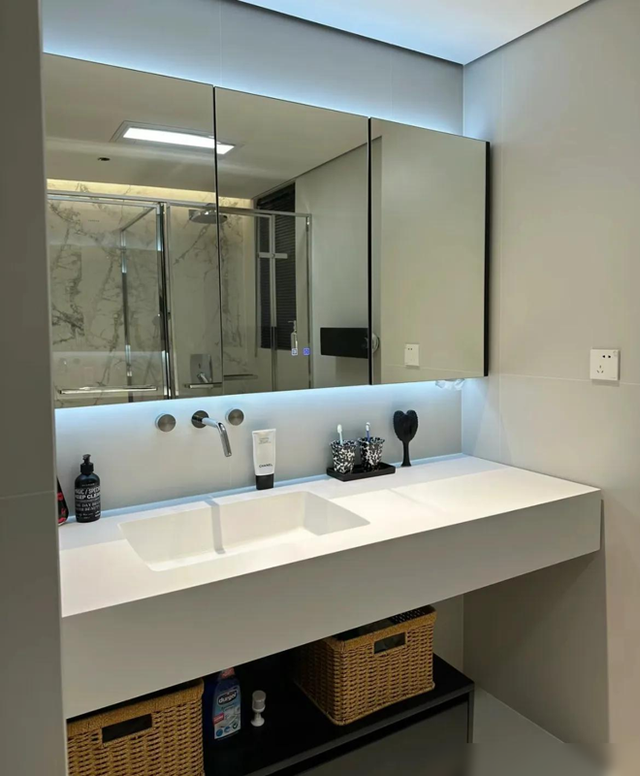 卫生间一般以实用性为主,所以这时候加入一款镜柜就显得尤为合适 了。镜柜不仅具有镜子的功能,还提供了一个便于存放各种洗漱用品和化妆品的收纳空间。